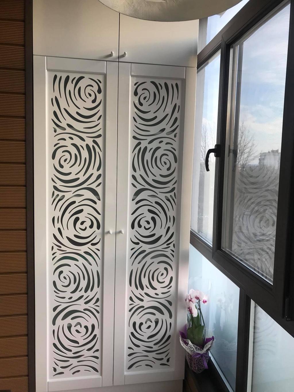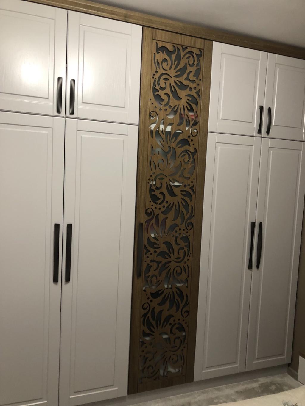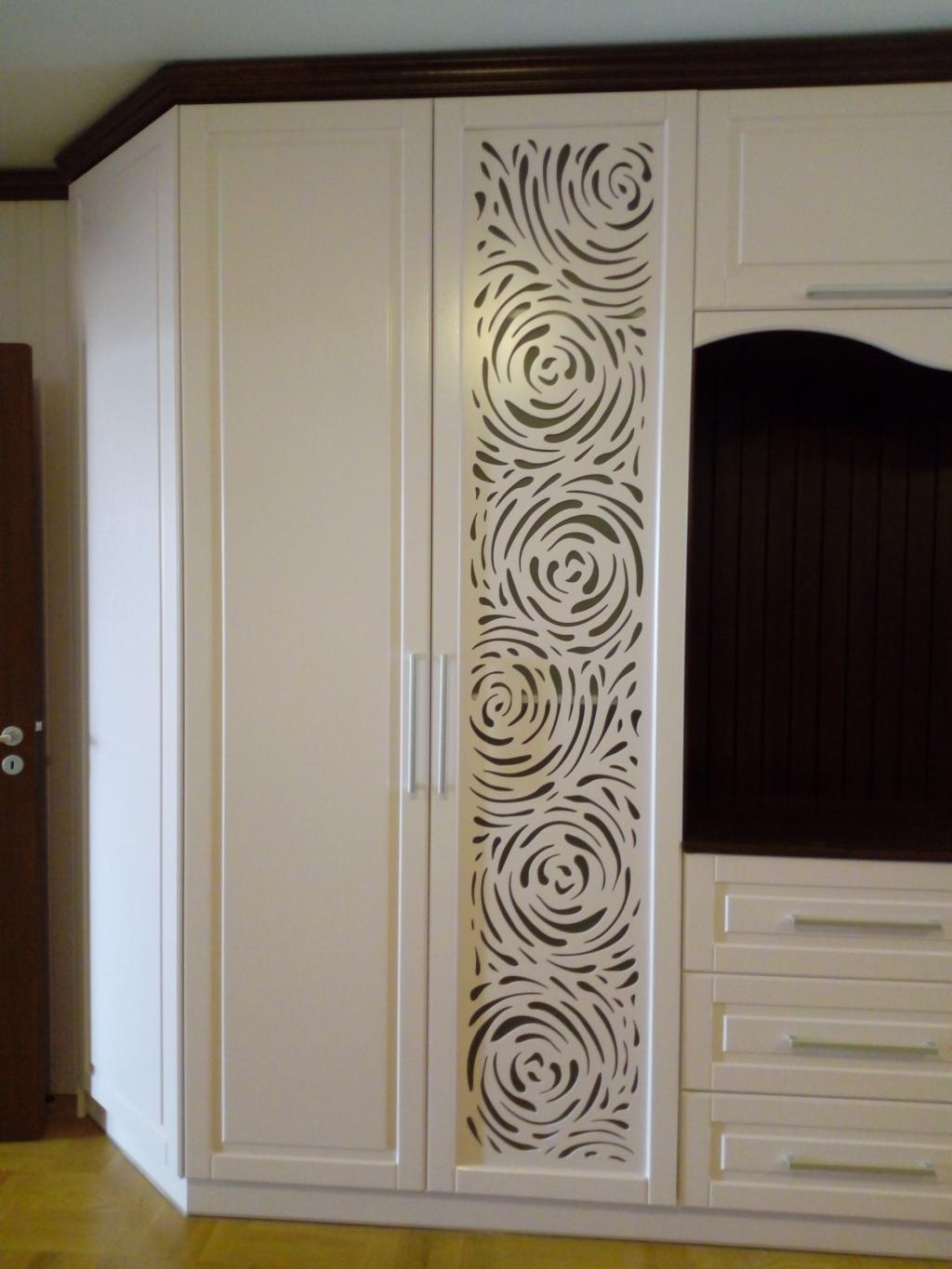 Гардероб от мдф с боя сатен и фрезовани ажурни врати.