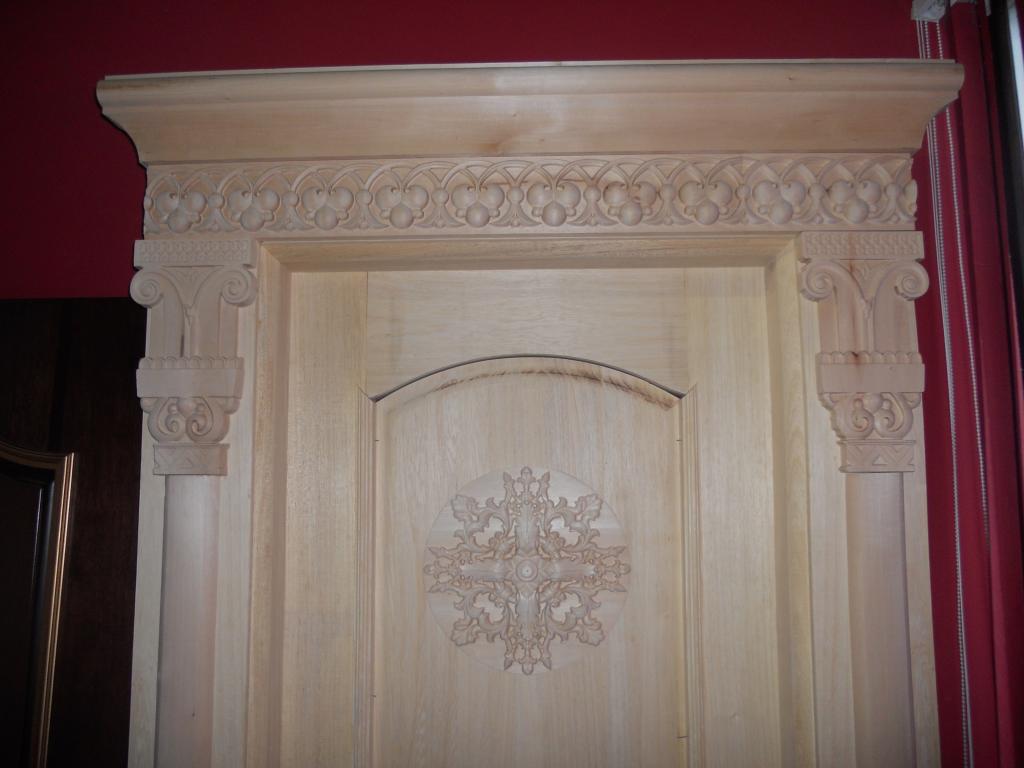Масивна врата от котто с дърворезби и декоративни первази с орнаменти.